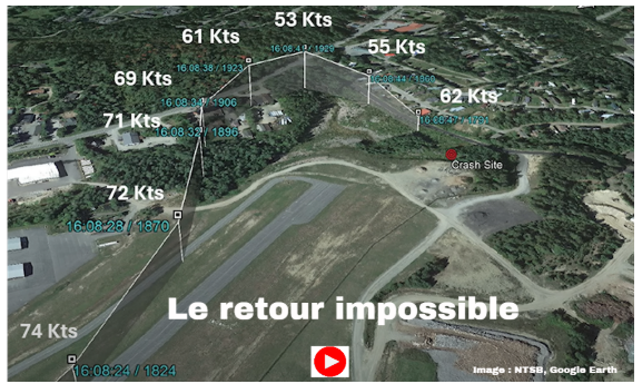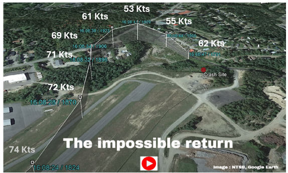 Deuxièmement, de quelle altitude avez-vous besoin pour effectuer ces virages et vous rendre à la piste? Connaissez-vous le taux de descente de votre avion en vol plané? Pour la plupart des petits avions ce taux est d’environ 600-900 pieds par minute. Donc si vous étiez à 1200 pieds d’altitude lors de votre panne moteur et que vous avez pris un peu de temps pour vous mettre en vol plané et essayer de redémarrer vous êtes probablement près de 1000 pieds pour commencer votre retour. Si vous effectuez un virage V1, il vous faudra une minute pour tourner à 180⁰. Si votre taux de descente est de 700 pieds par minute vous êtes maintenant à 300 pieds d’altitude; et vous êtes loin d’être aligné avec la piste. Vous êtes maintenant dans une zone très dangereuse, là où les erreurs de pilotages ne pardonnent pas et sont fréquentes. Le réflex de plusieurs sera d’augmenter l’angle d’inclinaison et de tirer sur le gouvernail de profondeur pour espérer faire la piste. Vous êtes maintenant en situation de contrôle inversé et l’AOA et la charge de l’aile intérieur ont augmentés. Vous êtes sur le point de partir en vrille. À 300 pieds, vous n’avez aucune chance de récupérer.