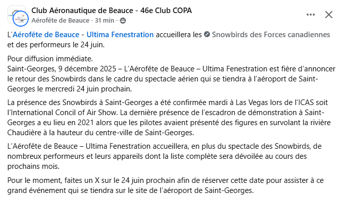 Copie de la publication faite pr le Club Aéronautique de la Beauce sur leur page Facebook