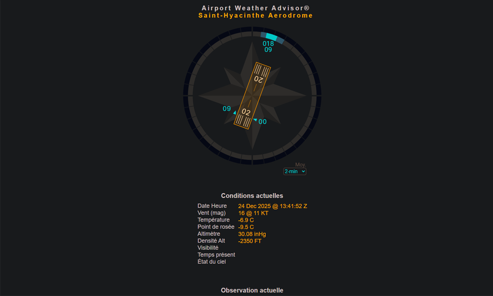 Saint-Hyacinthe airport (CSU3) is in the process of validation and certification for an AWOS station from Transport Canada and NAV Canada. The AWOS station frequency is 122,175 MHz. While under certification process, the weather information can be considered as being valid and reflecting the actual conditions at CSU3.